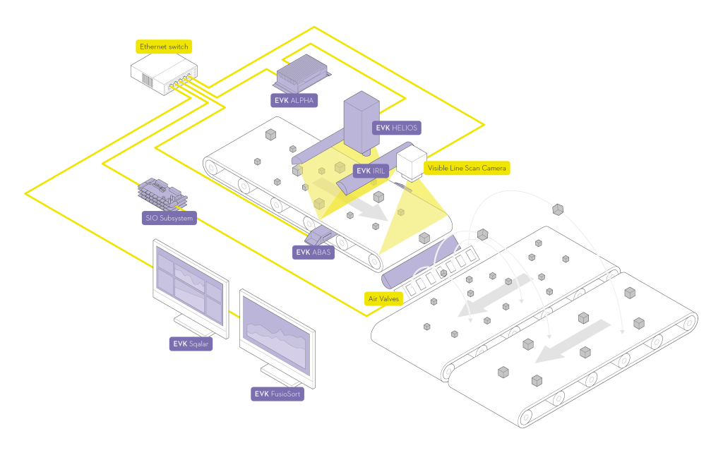 The EVK SQALAR software analyzes the chemical properties of individual objects qualitatively and quantitatively and helps to develop chemometric models for industrial applications. EVK STREAM Supervisor monitors industrial material flows at multiple points and the key data obtained provides information about material distribution, belt occupancy, and material composition.