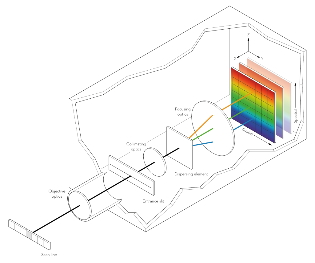 A typical push-broom hyperspectral camera consists of an objective lens, an entrance slit, a collimator, a dispersive element, the focusing optics, and an imaging sensor. How these parts are arranged is shown in the following figure.