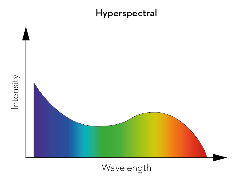 Hyperspectral cameras take the final step from being solely imaging cameras to actual spectrometers. They provide dozens to hundreds of spectral bands, usually directly adjacent and evenly distributed. This allows hyperspectral systems to apply established spectroscopic techniques such as derivative spectroscopy, chemometrics, and others. As a result, they become highly versatile tools for various applications in chemical detection, analytics, and sensor-based sorting.