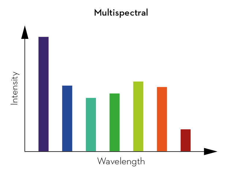 Multispectral cameras offer a larger number of spectral bands compared to RGB cameras, typically ranging from four to ten bands. These bands can be customized depending on the application and offer a cost-effective option for simple sorting applications. However, the bands in multispectral cameras are not usually directly adjacent or evenly distributed, making them unsuitable for spectroscopy.